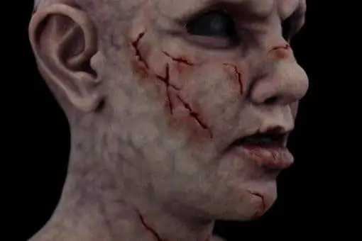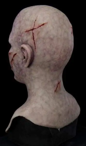 Pasusie the Ghoul is a possessed little girl with a cherubic face and multiple scars and scratches. She could be a scared victim of trauma ,a shambling zombie taken too young, or an exorcist’s worst nightmare. Female Fit Mask (will accommodate anyone whose head is between 20.25 – 21.75 inches in circumference)