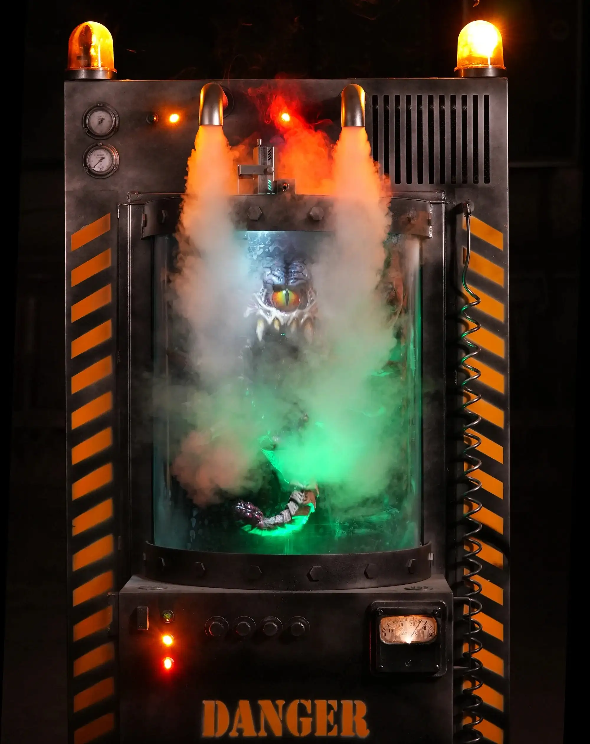 Alien Parasite is a scary and high-impact animatronic! A captured alien parasite moves and shakes inside its high-tech containment unit, and appears to be safe behind solid plexiglass and metal. Suddenly you hear an alert! “Systems Failing, all personnel evacuate immediately.” Emergency lights go off as the unit shrouds in fog. You gaze into the fog and just when you begin to breathe a sigh of relief that the alien is still contained…IT BREAKS FREE, jumping forward at you, creating a tremendous scare!