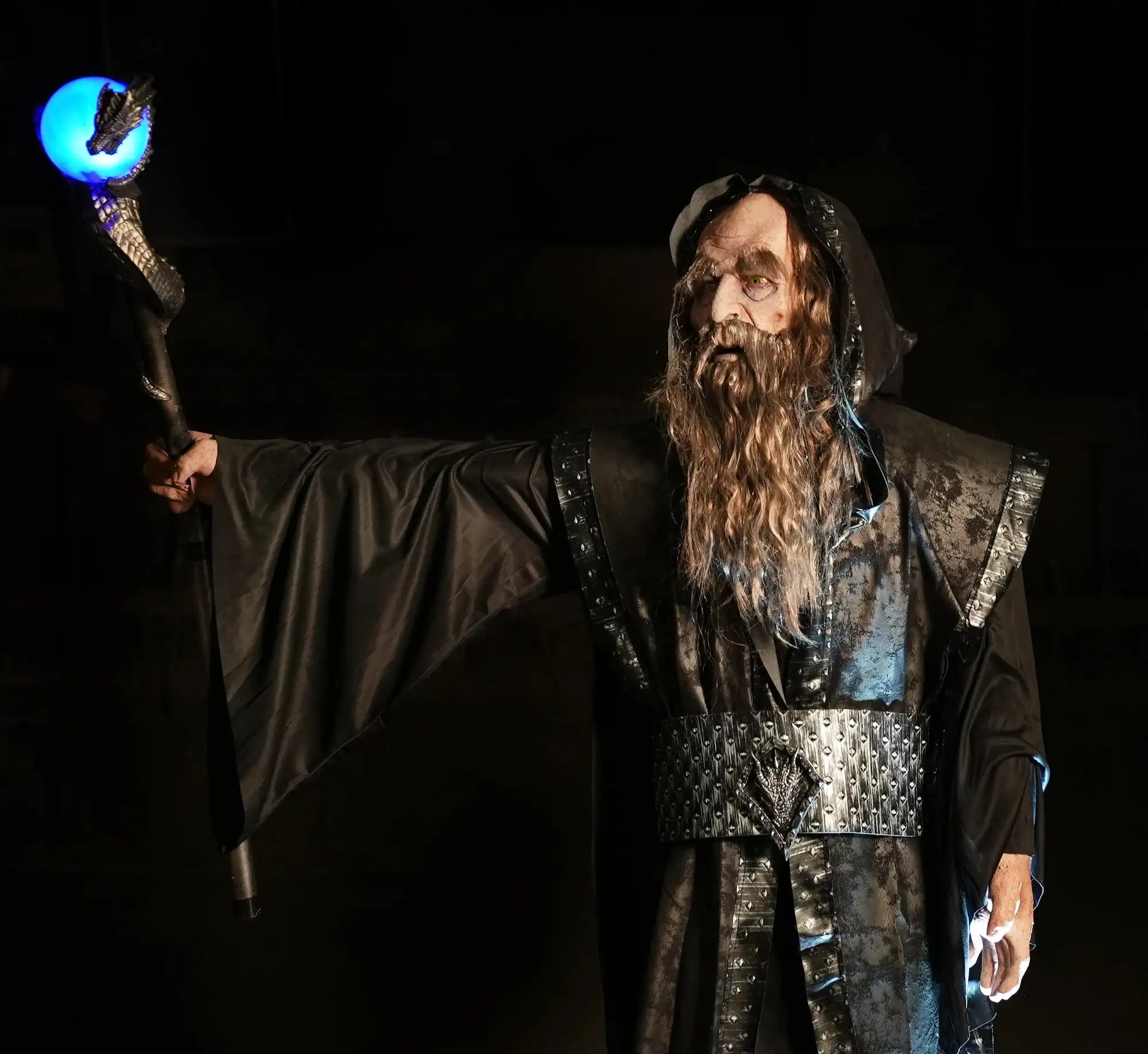 This professional Ancient Wizard talking animatronic is suitable for theme parks and haunts. The Ancient Wizard has an audio program with a moving mouth, head and arms. Lightning, a glowing staff, and fog add to the dramatic effect.