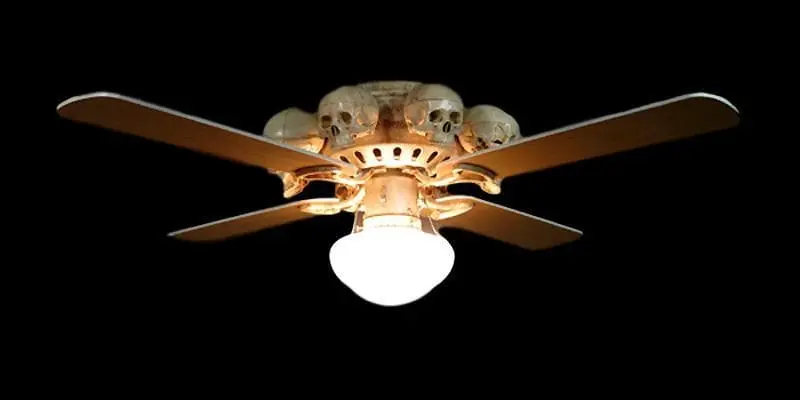 This unique skull ceiling fan with light is sure to make every one look up! Comes with four fan blades and eight small skulls. This is a flush mount fan with an arm span of about 42 inches and hangs down about 12 inches. Not only does it look cool, but it is a fully functional three speed fan with reverse. Light can either be on or off, with simple chain to activate. Never to early to start preparing for that Halloween air condition.