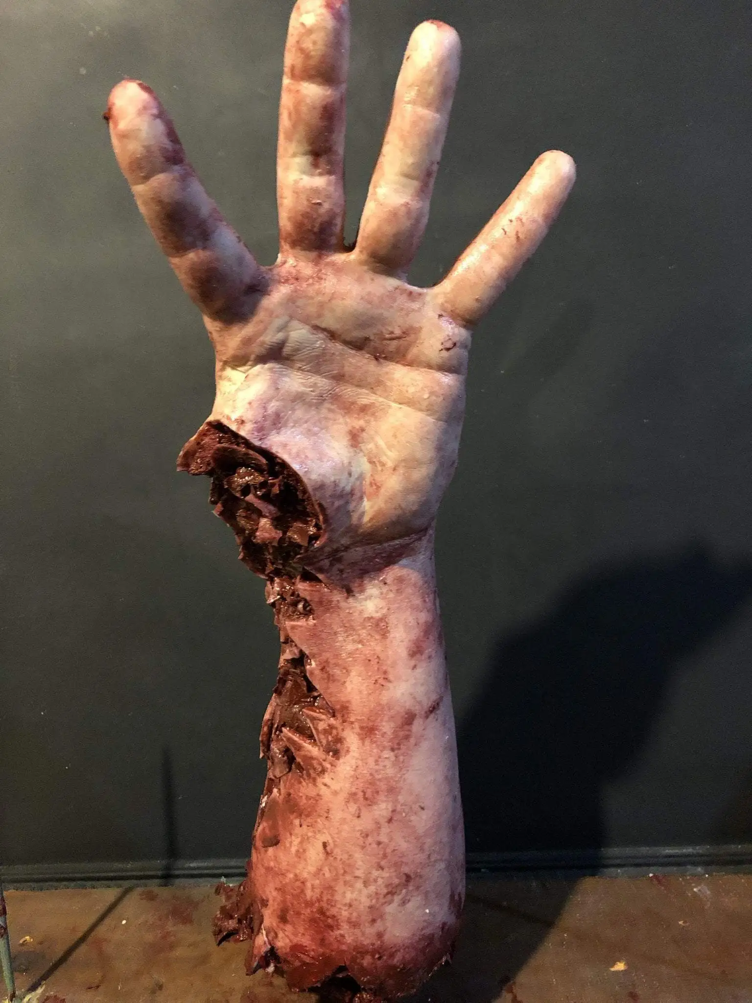 This silicone arm is highly detailed and film ready. The perfect addition to your haunt or film set. This male left arm has an injury simulation of a shark bite, or monster bite for you haunters. Hand is solid silicone to wrist. The forearm is skinned in silicone and foam filled.