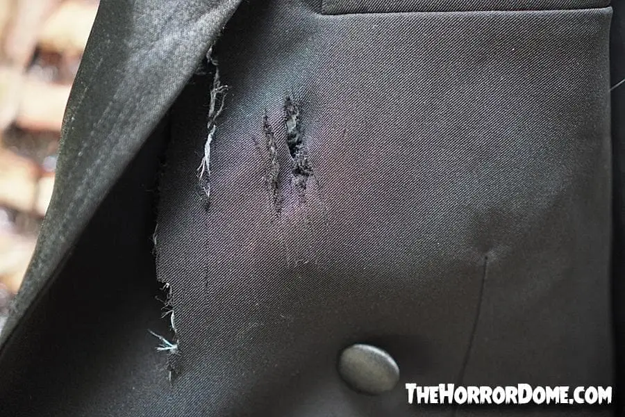 This Professional Tuxedo Jacket is Movie-Quality with hand-stitched designs and sewn-in shoulder padding to give the appearance of a wider build, comes with lining along with two tails in the back of the coat. The material has been meticulously stressed, stained, and discolored to give the appearance of age. This is a movie quality clothing from the Creators at TheHorrorDome.com