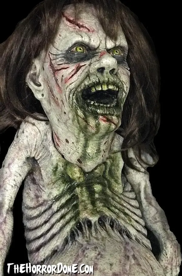 Possessed by a demonic entity, this poor soul is rotten to the core. Despite being separated from her Mother, she refuses to die. With menacing, bloodshot eyes, slashed leathery skin, and a grotesque mouth dripping green bile, this Exorcist Baby curses the unlucky few who cross her path. Perfect for any haunted house, the Possessed Baby puppet Halloween decoration is a finely detailed prop that looks eerily realistic. Hand painted and produced by the experts at The Horror Dome, with movable mouth, head and arms, this puppet will give nightmares to the local trick or treaters. Pair this puppet with an adult Zombie costume and compete a ferocious family unit.